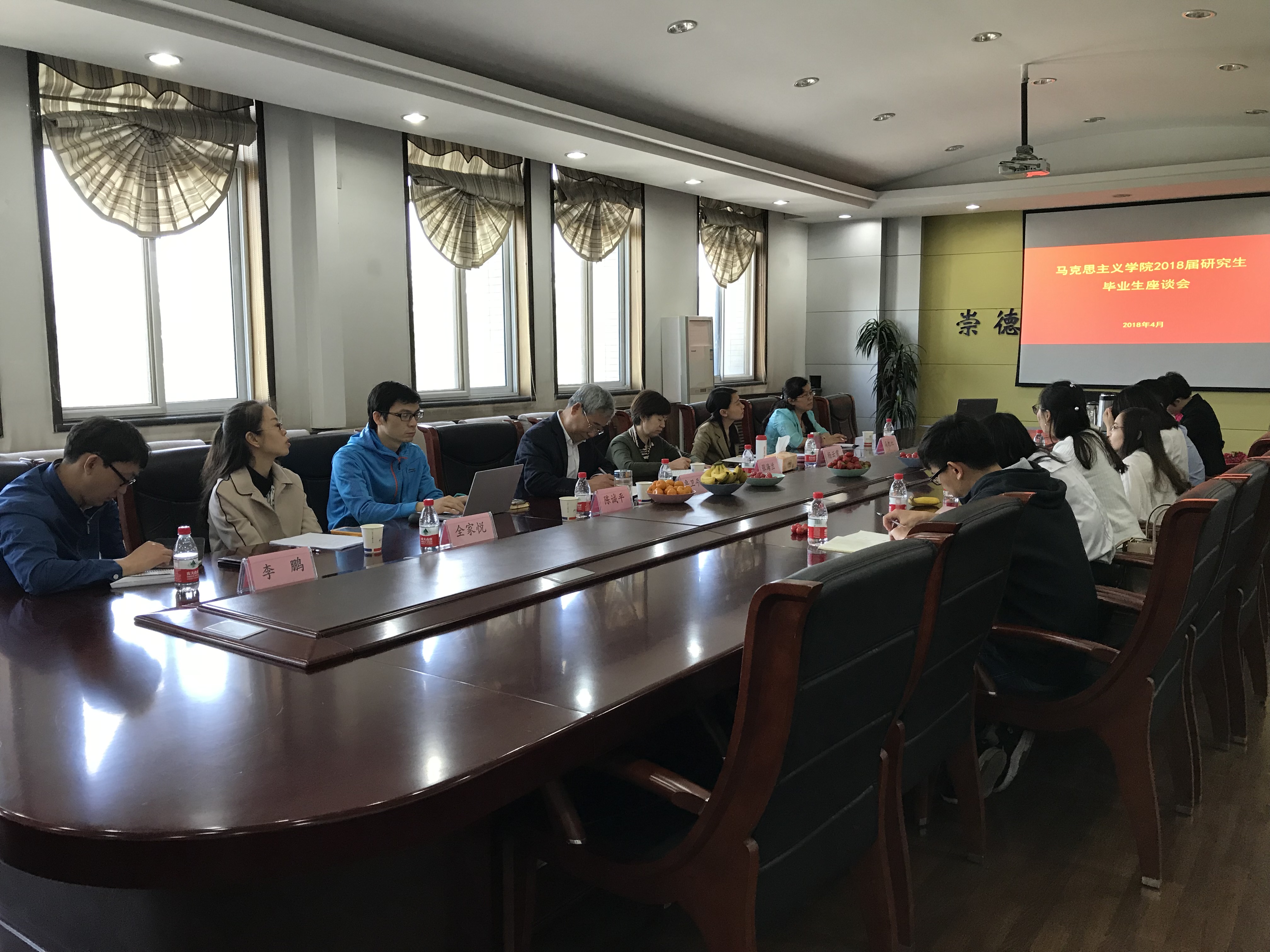 4月4日上午,马克思主义学院召开2018届研究生毕业生座谈会,学校纪委书记张海兰,马克思主义学院院长杨云霞,马克思主义学院党委书记鲁卫平,院长助理李鹏、全家悦,学院教师代表高旭红、陈诚平,以及2018届研究生毕业生代表参加座谈会。