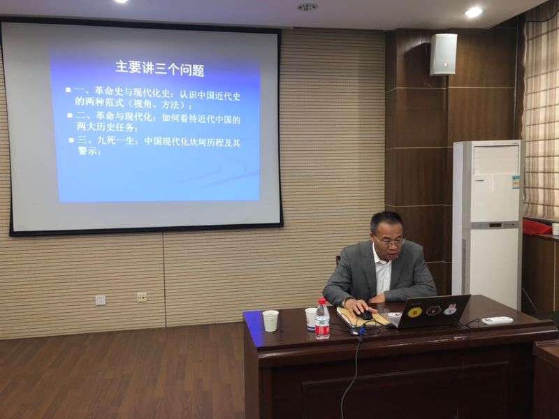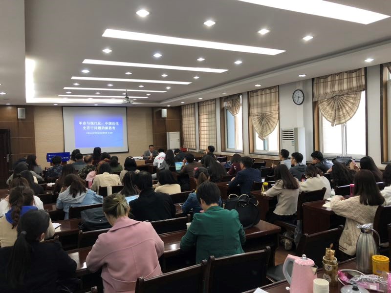 3月27日下午,在马克思主义学院305会议室,中国社会科学院近代史所研究员左玉河教授应邀为我院师生作了题为《革命与现代化:中国近代史若干问题的新思考》的学术报告。我院郝保权副院长致欢迎词,秦燕教授、汪永平教授、张淑华副教授等教师以及博士、硕士研究生共40余人共同聆听了报告会。