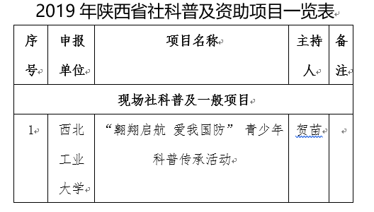 按照省科技之春领导小组办公室《关于开展陕西省第二十七届“科技之春”宣传月活动的通知》要求,省社科联下发了《关于申报2019年度陕西省社科普及活动资助项目的通知》(陕社科联〔2019〕5号),经过单位推荐,共申报了400余项科普活动。经过评审,确定立项101项,其中我院贺苗副教授申报的“翱翔启航 爱我国防” 青少年科普传承活动项目立项成功。现将获批项目予以公布。希望广大科研工作者继续努力,在各类基金项目的申报上积极主动,取得更大的突破,为马克思主义学院的发展和繁荣作出新的贡献。