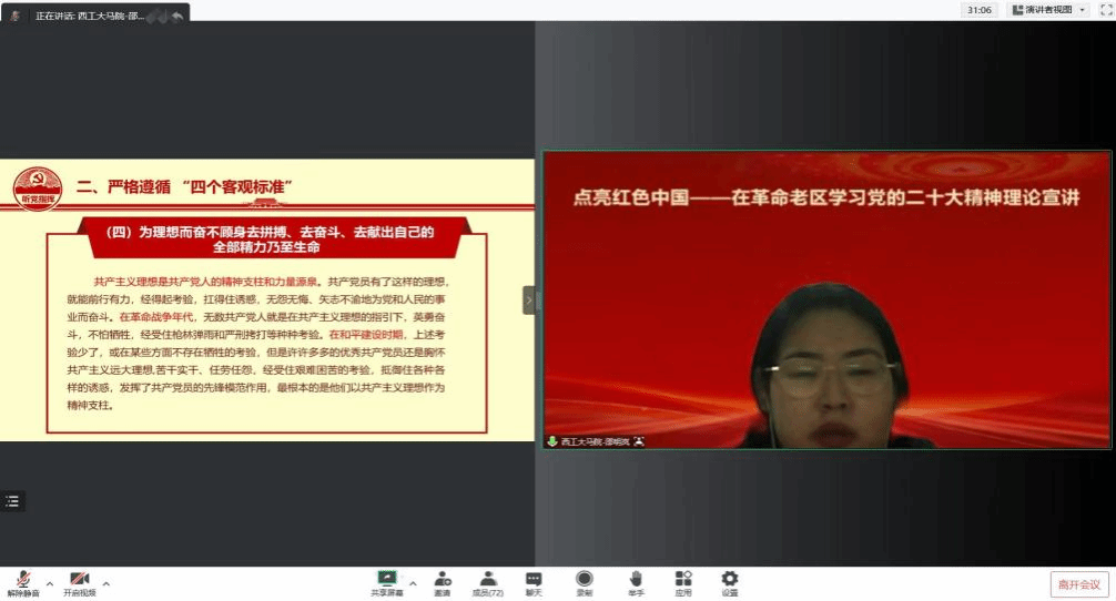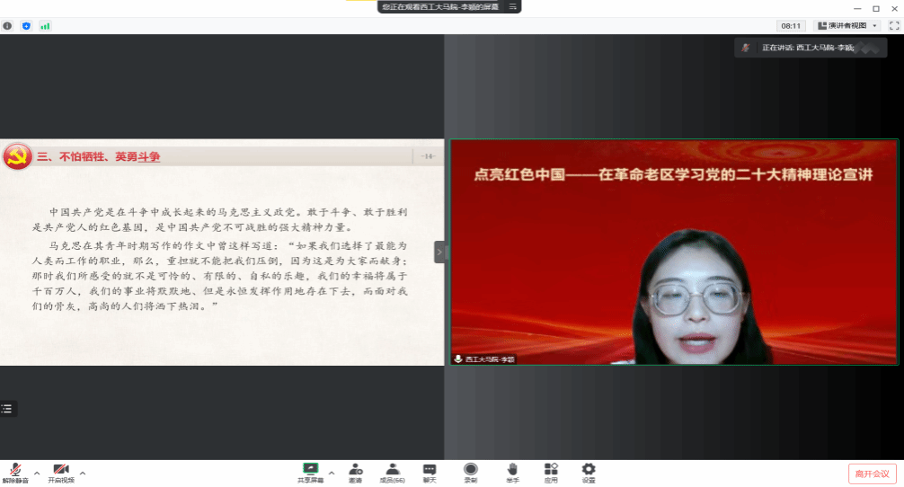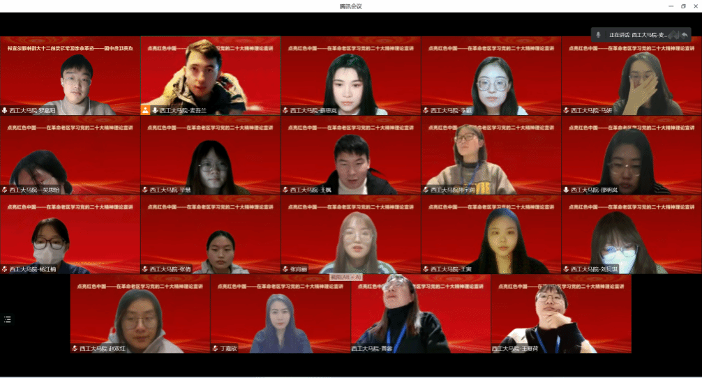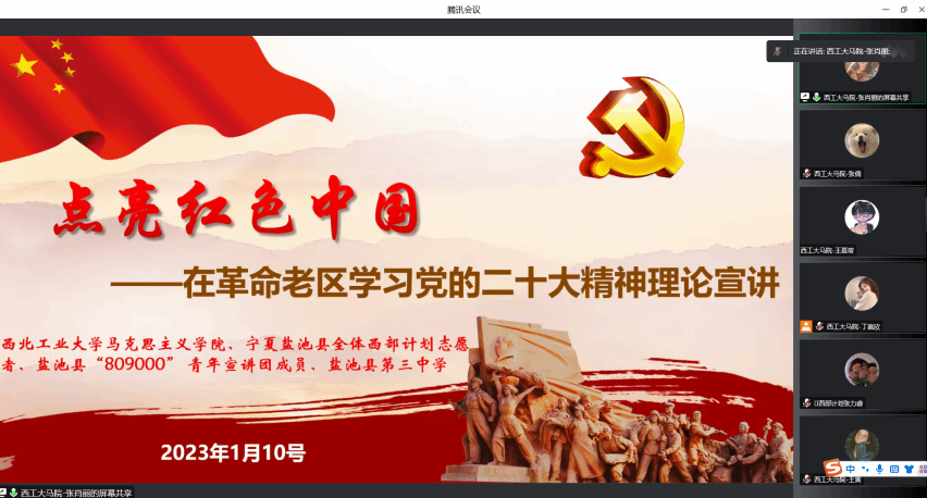 学习好、宣传好、贯彻好、落实好党的二十大精神,是当前和今后一个时期全党全国的首要政治任务。为引导广大青年深入学习和深刻领会党的二十大精神,增强守初心、担使命的思想自觉和行动自觉,2023年1月10日,由西北工业大学马克思主义学院王换老师指导的20余名硕士研究生组成的“点亮红色中国”党的二十大精神进基层·青春逐梦行实践队,面向宁夏革命老区团员青年开展党的二十大精神宣讲。本次宣讲由张肖丽同学主持,受众包括来自宁夏盐池县西部计划志愿者、盐池县“809000”青年宣讲团成员、盐池县第三中学学生等近500名同学。