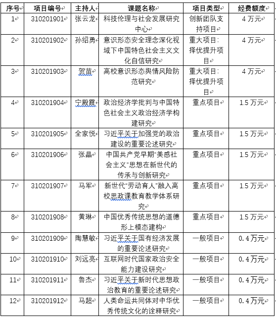 根据马克思主义学院《中央高校基本科研业务费实施办法》有关规定,我院2019年度中央高校基本科研业务费项目通过匿名评审,立项12项,现予以公布。