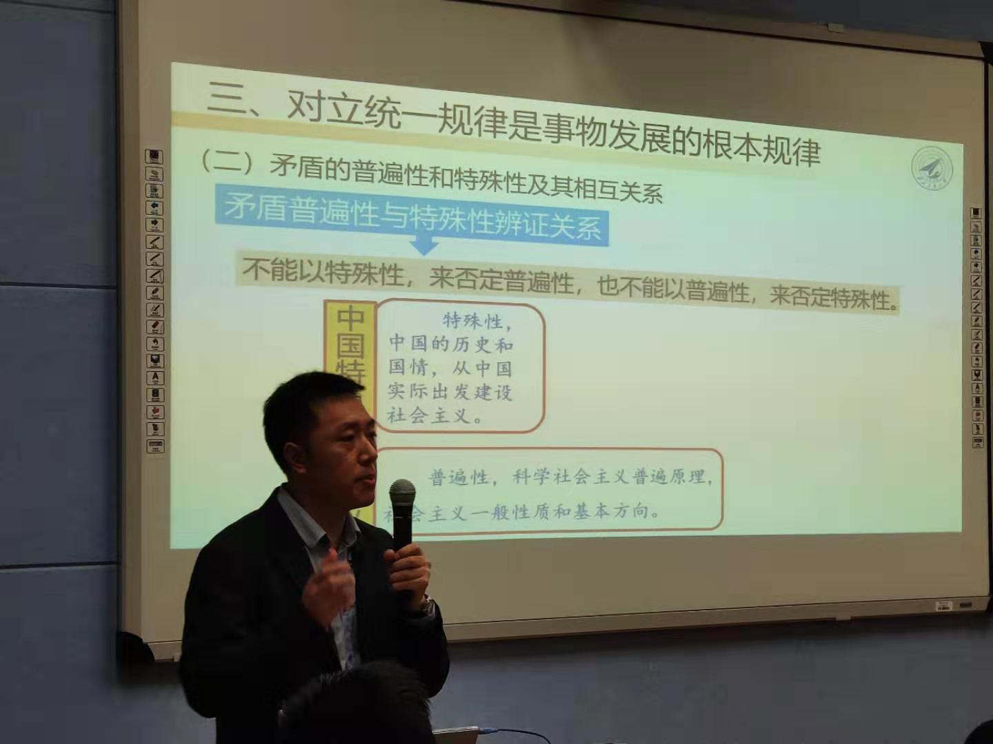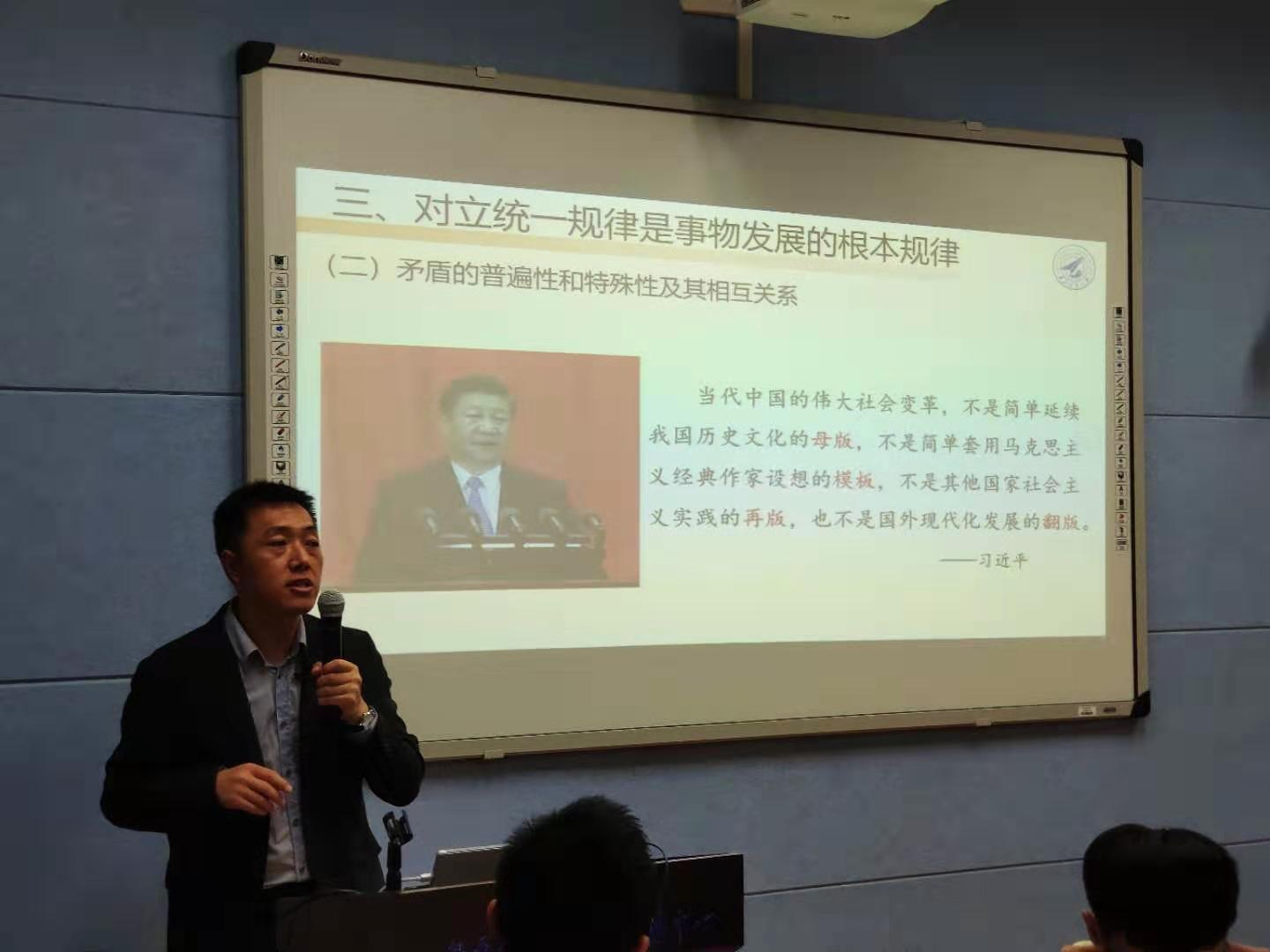 本次试点课着重讲授“矛盾论”的相关内容。课上,马军老师不但讲授矛盾论的理论,更运用矛盾论的观点、方法,向同学们讲授“中国特色社会主义为什么好”“新时代我国社会的主要矛盾”等内容,授课内容详实生动,注重理论密切联系实际,让同学们在学习知识的同时,更加坚定“四个自信”。