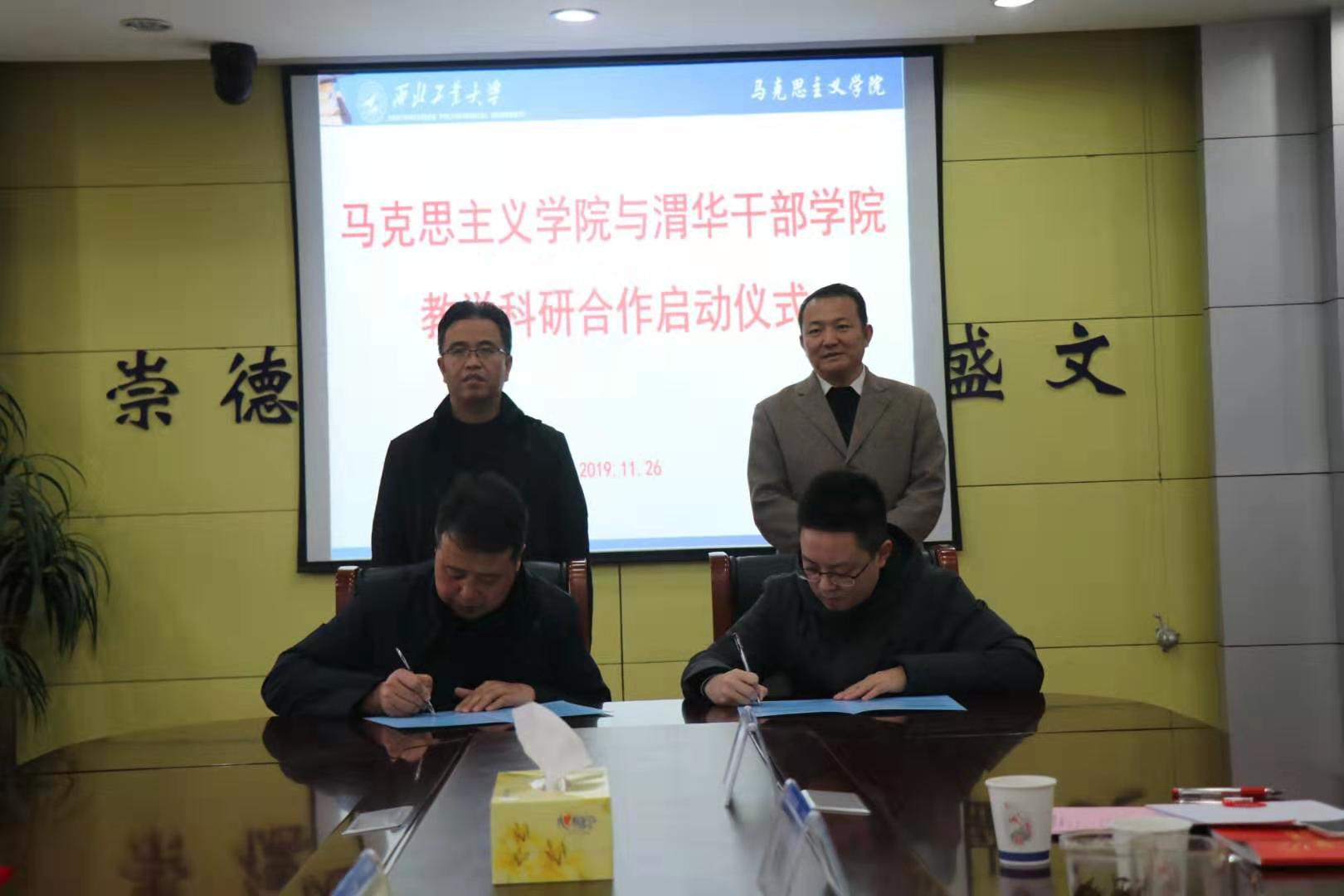 西北工业大学马克思主义学院与渭华干部学院战略合作暨兼职教授聘用协议签订仪式,于11月26日在西北工业大学马克思主义学院隆重举行。渭华干部学院常务副院长史欣荣、李运斌、教务部部长白向逸,西北工业大学马克思主义学院党委副书记(主持工作)吴闻川、副院长郝保权、副书记李鹏和渭华起义研究课题组教师出席了活动。会议由郝保权主持。