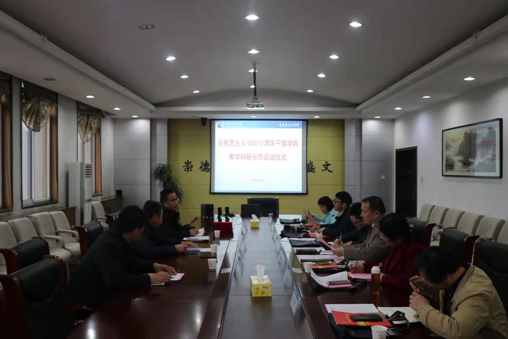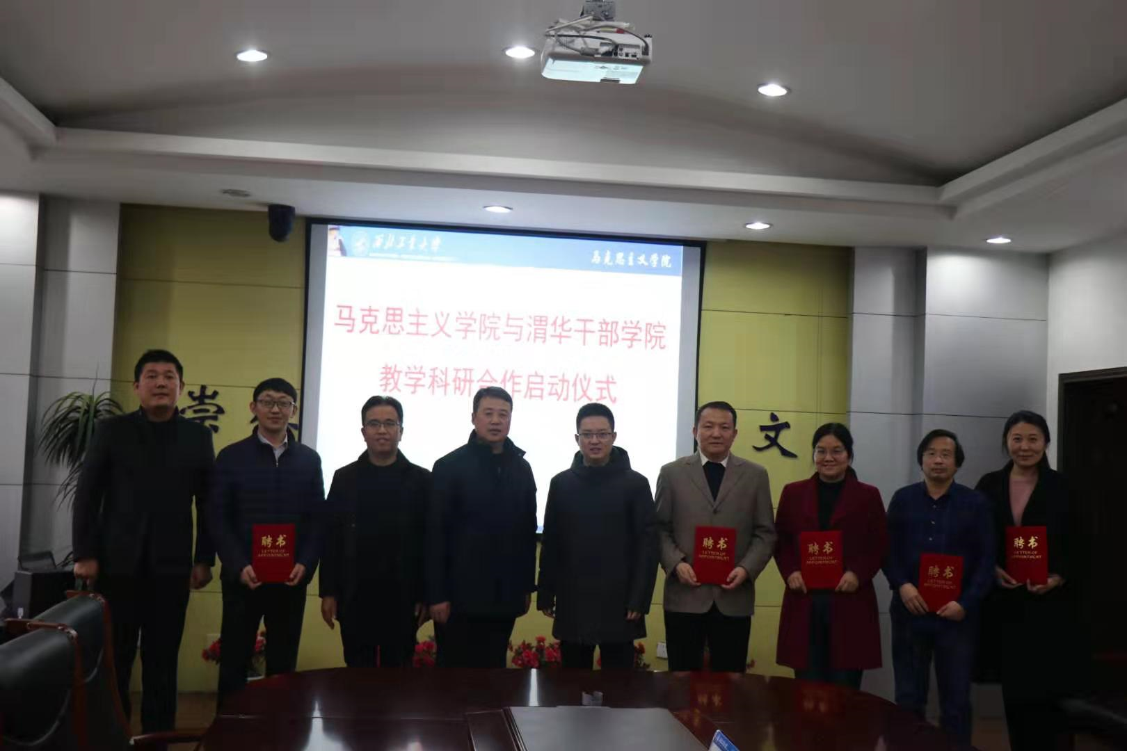 史欣荣、吴闻川分别代表渭华干部学院与西工大马克思主义学院签订双方战略合作协议,史欣荣向汪永平等六位老师颁发了渭华干部学院兼职教授聘书。随后双方就教学和科研等问题进行了自由交流讨论。