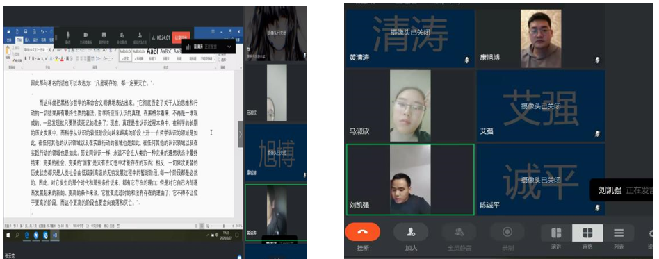 2020年4月25日,西工大“启真明智”第三期读书会在钉钉线上如期举行。此次读书会由博士生艾强主持,学院杨冰郁老师、陈诚平老师以及10多位硕博生共同参加,以《路德维希·费尔巴哈和德国古典哲学的终结》第三章作为研读篇目,展开了交流与讨论。