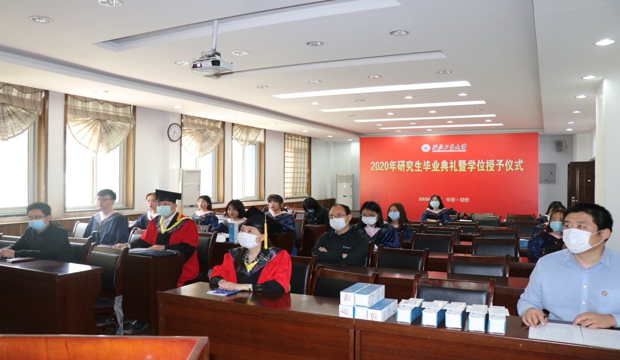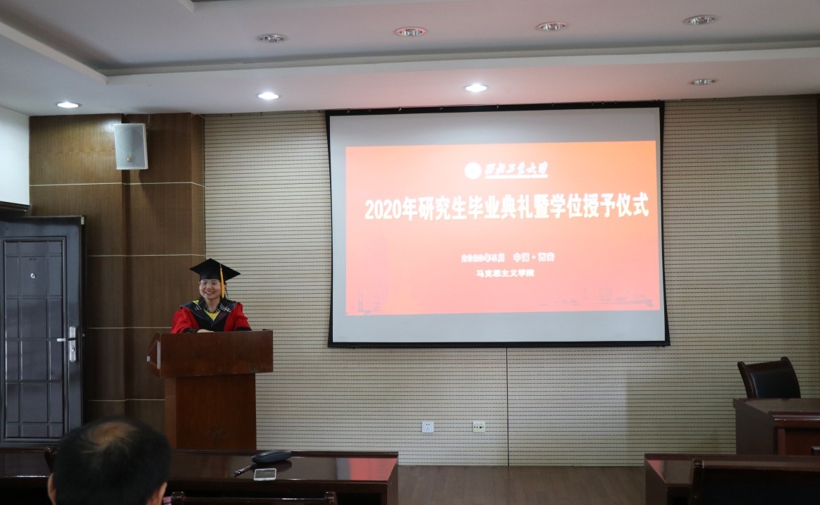 此次毕业典礼由于受疫情的影响,2020届研究生的毕业典礼以学校主会场云直播和学院分会场典礼仪式两部分举行。5月9日下午14:00,马克思主义学院在学院305会议室举行了专属马院师生的“2020年研究生毕业典礼暨学位授予仪式”。