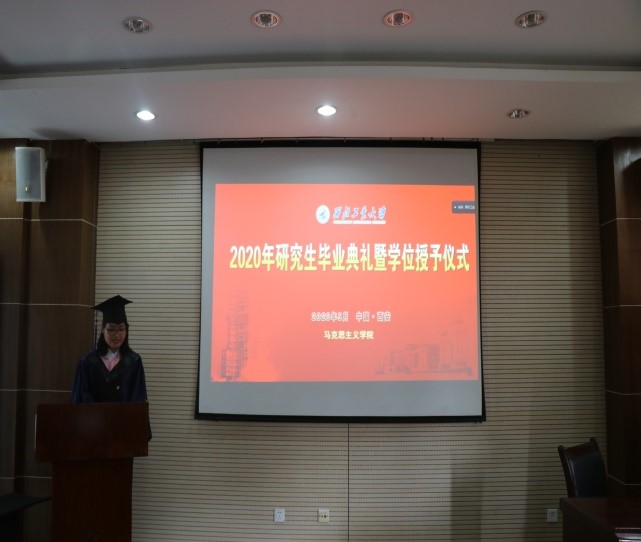 随后,学院举行了分会场学位授予仪式,由党委副书记李刚主持。仪式开始,学院党委书记吴闻川宣读了马院2020年研究生毕业名单,紧接着硕士毕业生代表王酒莉同学发言,她代表毕业生诚挚地表达了对学校、学院的敬意,用朴实的文字记录着三年来的点点滴滴,并借用梁启超在《中国少年说》中唤醒青年的话语,激励同学们勇担时代之责,为国家贡献自己的青春力量。然后,学院师长为毕业生赠送了毕业礼物,鼓励同学们在新的工作岗位上大展鸿图。研究生导师郝保权作为导师代表对毕业生寄予希望,希望同学们在以后的工作、学习、生活中,保持定力,保持警醒,奋发向上,干事创业。在未来的日子里,像朝阳一般,心有芳华,无惧岁月,做一个有朝气、有志气、有底气、有骨气的新时代马克思主义青年。最后,马克思主义学院院长、学位评定委员会分会主席杨云霞老师与同学们交流,她勉励毕业生在今后的日子里,更要勤奋努力,百尺竿头更进一步。作为马院第一届毕业的研究生,我们共同见证了马院的发展,共同为学院的进步付出了努力和心血,特别是在2020年4月2日成功取得马克思主义理论一级学科博士点,更是让所有人终身铭记,同时学院也见证了同学们的成长成才,希望毕业生们在步入社会以后,常回来看看,分享成功和喜悦,在未来的时光里,展现青马风采,前程似锦,大有作为!