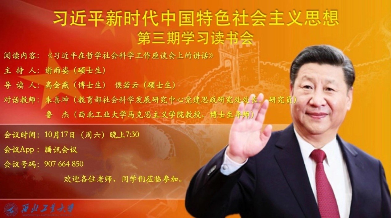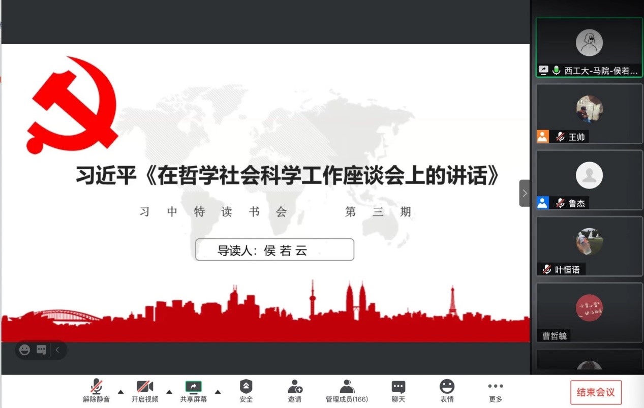 探寻革命圣地,领悟红色精神。10月17日晚,西北工业大学马克思主义学院2020级全体硕士研究生身处革命圣地延安,在亲身领悟我党发展历程与习近平总书记辛勤的知青岁月后于晚7:30,参与习近平新时代中国特色社会主义思想学习读书会开启第三期读书交流活动。此次活动通过腾讯会议线上进行,由我院硕士生谢雨姿主持,教育部高等学校社会科学发展研究中心党建思政研究处处长、研究员朱喜坤,西北工业大学马克思主义学院博士生导师鲁杰教授作为对话教师应邀参加,我院党委副书记李刚全程参与,本次读书会176名高校师生参与,再创读书会人数新高。