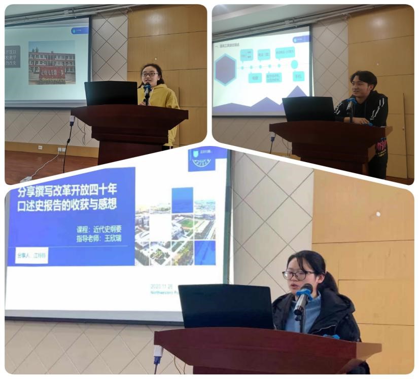 首先由西北工业大学学工部副部长马俊进行大会致辞。其次樊明方教授、赵璐、石培玲教授作为评审专家,分别对获奖学生的口述史进行深入细致的点评和总结。他们认为,同学们的口述史主题鲜明、方法科学、涉及的范围较广。不仅关注衣食住行,而且关注房地产等与人民生活息息相关的方面,采访细致,写作规范。但也同时存在思维方式固化,“非黑即白,非此即彼”倾向。随后,获奖学生代表宋紫寒、江玲玲、张剑科分别通过PPT向大家分享自己改革开放口述史实践的过程、内容及收获。
