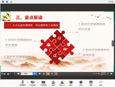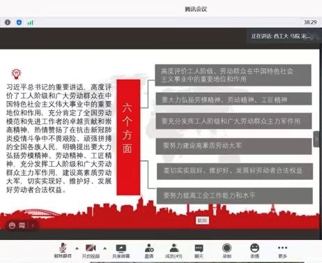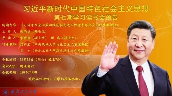 习近平总书记强调,社会主义是干出来的,新时代是奋斗出来。劳动模范是民族的精英、人民的楷模,是共和国的功臣。我国是人民当家作主的社会主义国家,党和国家始终坚持全心全意依靠工人阶级方针,始终高度重视工人阶级和广大劳动群众在党和国家事业发展中的重要地位,始终高度重视发挥劳动模范和先进工作者的重要作用。为了深入学习习近平总书记在全国劳动模范和先进工作者表彰大会上的重要讲话精神,2020年12月12日,西北工业大学马克思主义学院习近平新时代中国特色社会主义思想学习读书会第七期活动主题重点围绕《习近平在全国劳动模范和先进工作者表彰大会上的重要讲话》进行展开。此次活动由我院硕士生谢雨姿主持,中央民族大学马克思主义学院教授、学科点主任、研究生导师刘树宏老师,西北工业大学马克思主义学院博士生导师鲁杰教授作为对话教师应邀参加。