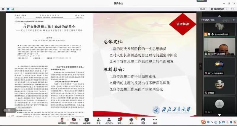 习近平总书记在全国宣传思想工作会议上的重要讲话,深刻总结了党的十八大以来,党的宣传思想工作的历史性成就和历史性变革,深刻阐述了新形势下党的宣传思想工作的历史方位和使命任务,深刻回答了一系列方向性、根本性、全局性、战略性重大问题,对做好新形势下党的宣传思想工作作出重大部署。为了更好深入学习此次讲话内容与精神,2021年1月9日,西北工业大学马克思主义学院习近平新时代中国特色社会主义思想学习读书会第九期活动主题以《习近平2018年在全国宣传思想工作会议上的讲话》进行展开。此次活动由我院硕士生谢雨姿主持,浙江大学马克思主义学院副院长、博士生导师代玉启教授,西北工业大学马克思主义学院思想政治教育系主任、博士生导师鲁杰教授作为对话教师应邀参加,我院党委副书记李刚全程参与。