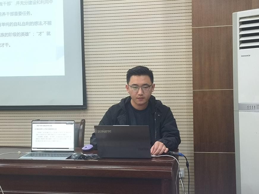 活动伊始,硕士生王家乐同学作为导读人,首先对年轻干部队伍建设的理论渊源进行了剖析。他系统梳理了马克思主义经典著作中的理论贡献、中华优秀传统文化的滋养,为年轻干部的成长提供了坚实的理论支撑。同时,他还详细阐释了新时代年轻干部成长的基本要素和具体路径,强调坚定理想信念、斗争精神、责任担当和道德情操在年轻干部成长中的关键作用。最后,他号召年轻干部要自觉践行党的创新理论,忠诚于党的事业,致力于为民造福,勇于担当作为,积极营造和维护良好的政治生态。