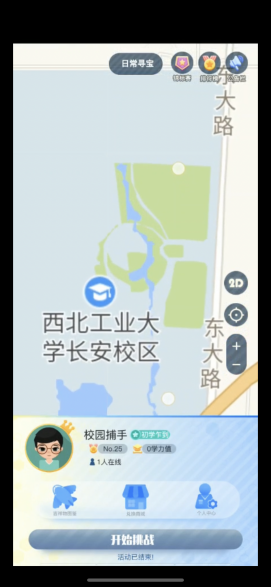 “思创空间”学习平台是西北工业大学党委学生工作部、马克思主义学院基于Unity工具开发的一款旨在通过“寓教于乐”的方式让大学生沉浸式学习思想政治理论知识的高校思想政治教育类学习平台。按照平台提供的虚拟仿真地图,学生可身处校园用独有的“雷达”去探测西工大元素“吉祥物”(如我校参与自主研制的航空、航天、航海等高尖端“大国重器”以及校园标志性建筑物)。再通过思想政治理论知识竞答的方式,将其捕获并赢得相应“学力值”,最终兑换精美的校园文创产品。