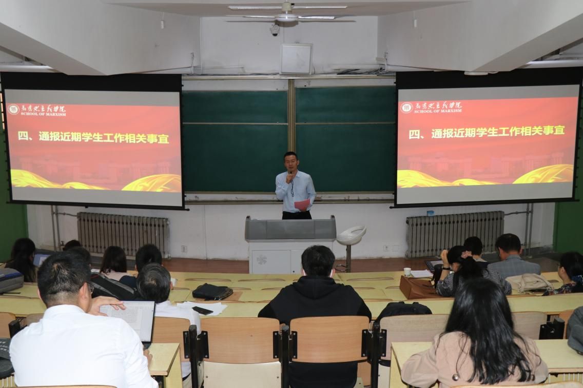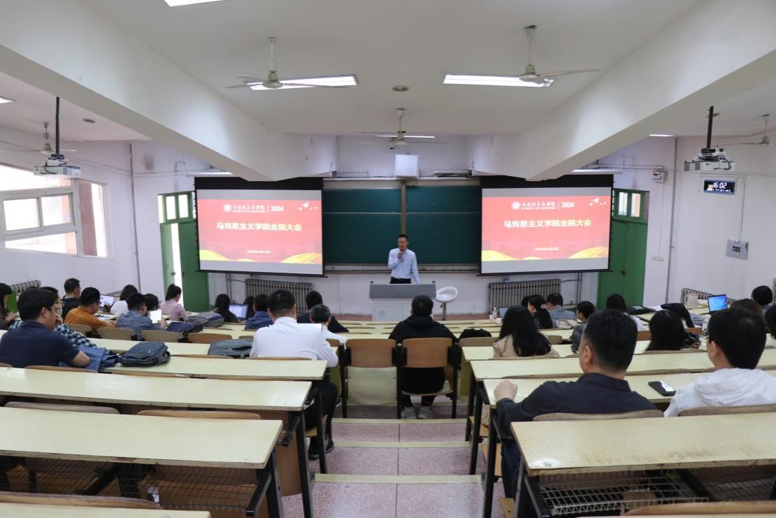 4月12日下午,马克思主义学院2024年春季学期第二次全院大会在友谊校区西馆XB104教室召开,学院全体教职工参加会议。会议由学院党委书记蒲传新主持。