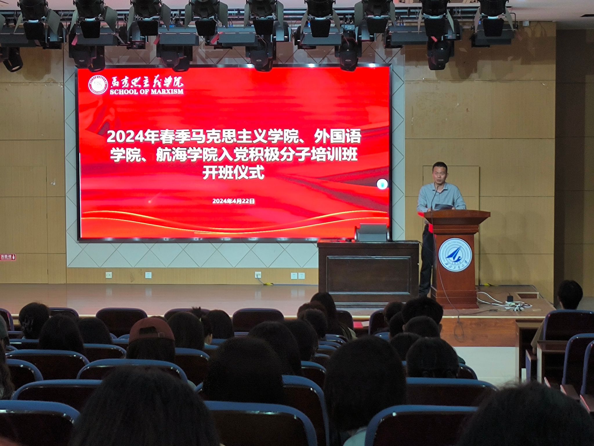 2024年4月22日,我校马克思主义学院党委书记蒲传新在马克思主义学院、外国语学院和航海学院联合举办的入党积极分子培训班开班仪式上,为师生们讲授党纪学习教育专题党课。