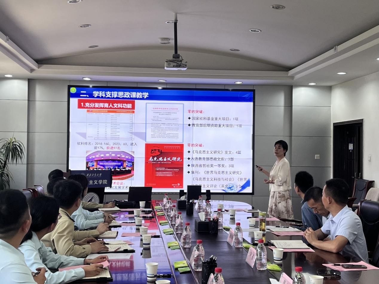 会议开始双方观看了西北工业大学马克思主义学院宣传片,接着蒲传新代表马克思主义学院对中国人民解放军火箭军工程大学政治系的来访表示欢迎,并向对方单位介绍了本次参会的相关人员以及学院概况、“127”目标、“总师育人文化”等内容。贺苗对研究机构、师资队伍、思政课建设、公共课教学等情况作详细介绍。中国人民解放军火箭军工程大学政治系主任高攀教授对学院的热情接待表示感谢,并就政治系的具体情况、主要构成、政治理论教学等方面作详细介绍。