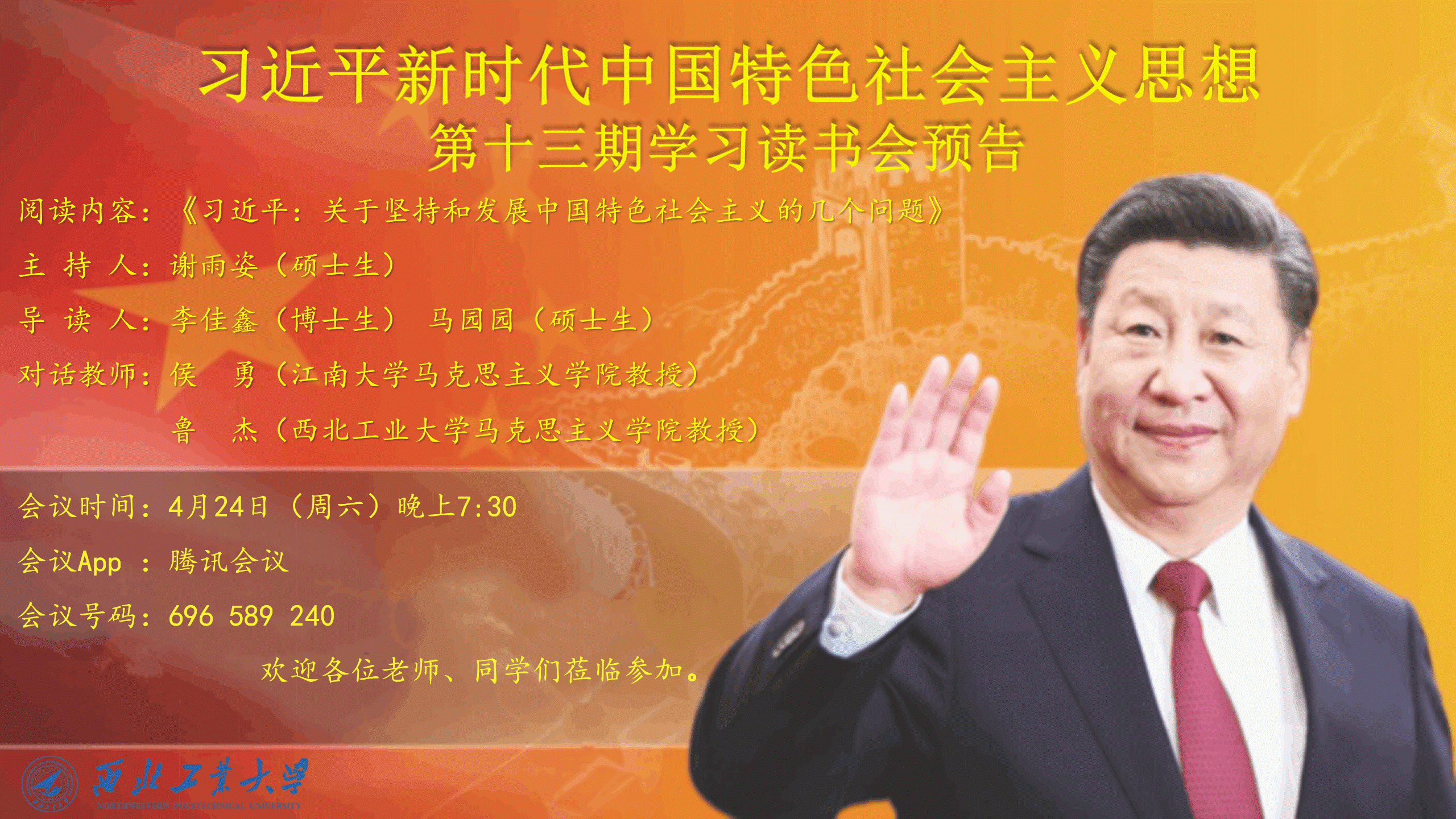 习近平总书记指出,中国特色社会主义承载着几代中国共产党人的理想和探索,寄托着无数仁人志士的夙愿和期盼,凝聚着亿万人民的奋斗和牺牲,是近代以来中国社会发展的必然选择,是发展中国、稳定中国的必由之路。因此,我们必须坚定不移地走中国特色社会主义道路,只有坚持和发展中国特色社会主义才能实现中华民族伟大复兴。2021年4月24日,西北工业大学马克思主义学院习近平新时代中国特色社会主义思想学习读书会第十三期活动主题围绕《习近平:关于坚持和发展中国特色社会主义的几个问题》进行学习研讨。本次读书会由我院思想政治教育系主任、博士生导师鲁杰教授发起,学院硕士生谢雨姿主持,特邀请江南大学马克思主义学院侯勇教授参与指导。