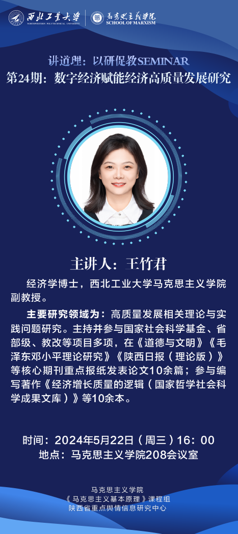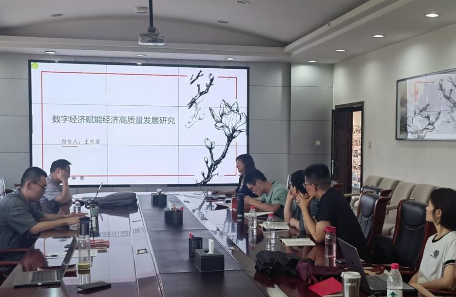 为进一步强化思政课建设与党的创新理论武装同步推进,为新进教师提供教学展示和磨课评课平台,不断加强教学团队内部教学与科研思想的碰撞交流,2024年5月22日下午,我校马克思主义学院马克思主义基本原理系在院楼208会议室举办第24期“讲道理——以研促教Seminar”。本期主题为《数字经济赋能经济高质量发展研究》,马克思主义基本原理系王竹君副教授做主题分享。