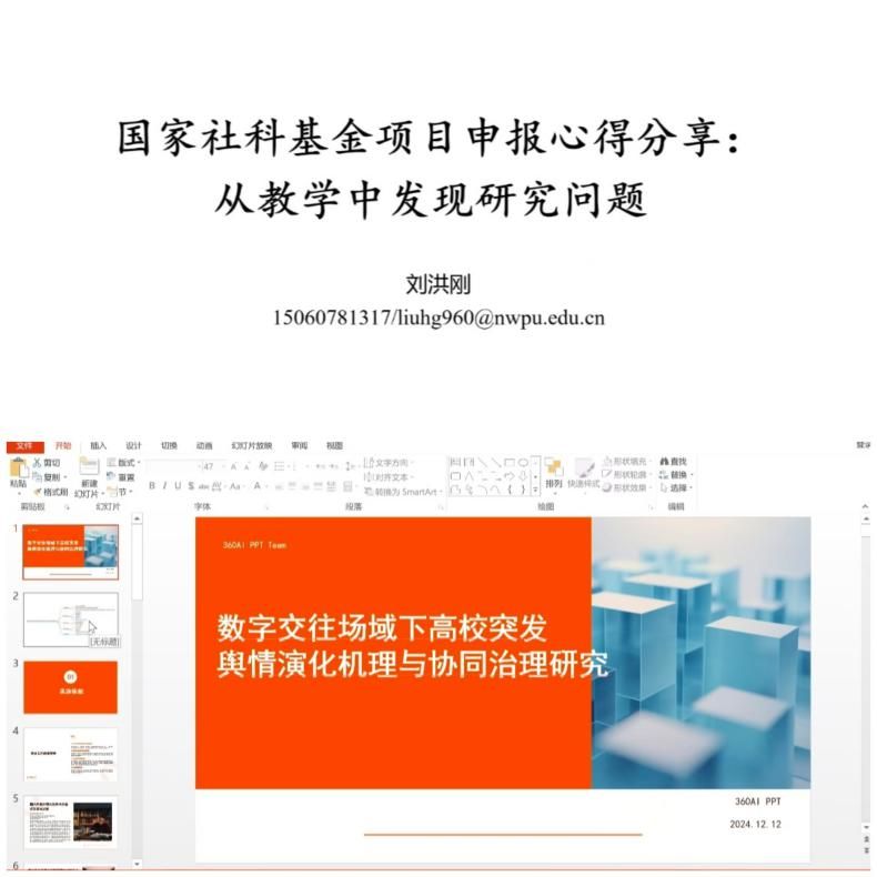 为深入学习贯彻党的二十届三中全会精神,统筹推进2025年国家自然科学基金申报工作,进一步深入探讨教学、科研相互转化关系,12月12日晚,马克思主义学院邀请学院刘洪刚教授和贺苗副教授线上为大家分享了“国家社科基金申报心得——从教学中发现研究问题”专题讲座。会议由贺苗副院长主持。