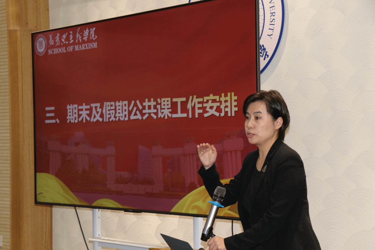 随后,贺苗通报了期末及假期公共课工作安排。她表示,思政课是学院工作的重中之重,同时强调临近期末,各位老师要认真对待课程考核工作,确保成绩公正合理。假期学院将继续开展集体备课活动,鼓励线上线下结合,通过共同努力,学院将继续强化学科特色,以“总师育人文化”为引领,推动教育事业的发展。