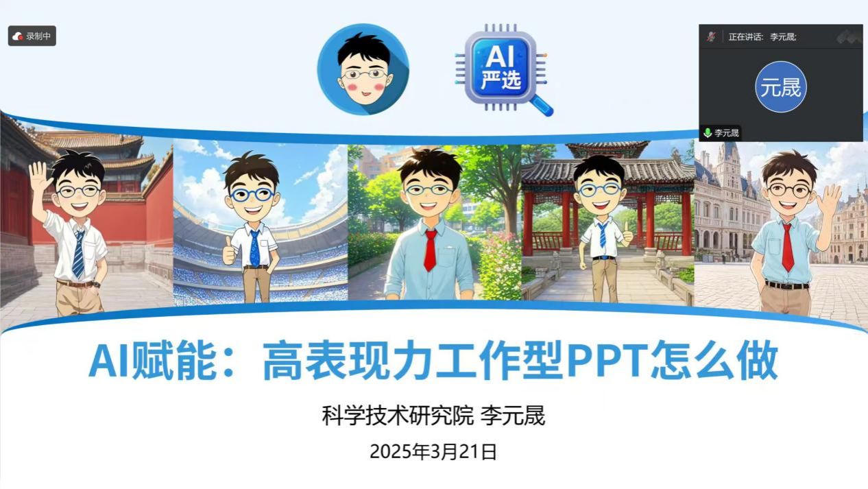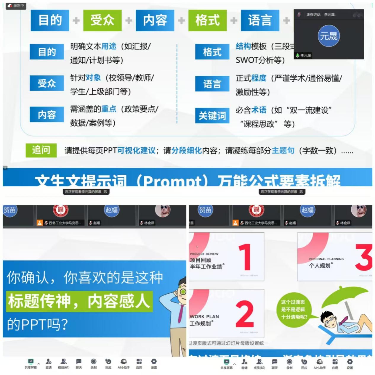 为深入学习贯彻党的二十届三中全会精神,落实国家教育数字化战略行动,3月21日晚,马克思主义学院邀请校科学技术研究院科研质量保密与科研服务大厅办公室主任、助理研究员李元晟老师开展了题为“AI赋能:高表现力工作型PPT怎么做”的第31期以研促教seminar专题讲座。本次会议由西北工业大学教务部、科学技术研究院、马克思主义学院和陕西省教科文卫体系统职工创新工作室主办,西安工业大学、西安翻译学院、陕西青年职业学院、西安欧亚学院和陕西省重点舆情信息研究中心协办。讲座由马克思主义学院副院长贺苗主持。