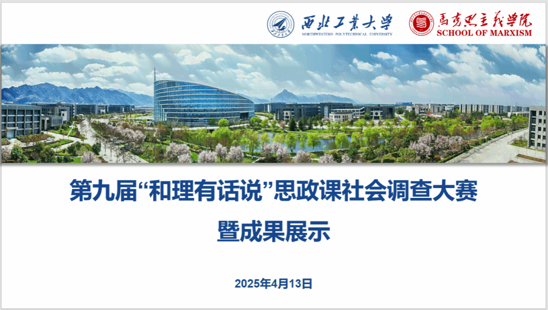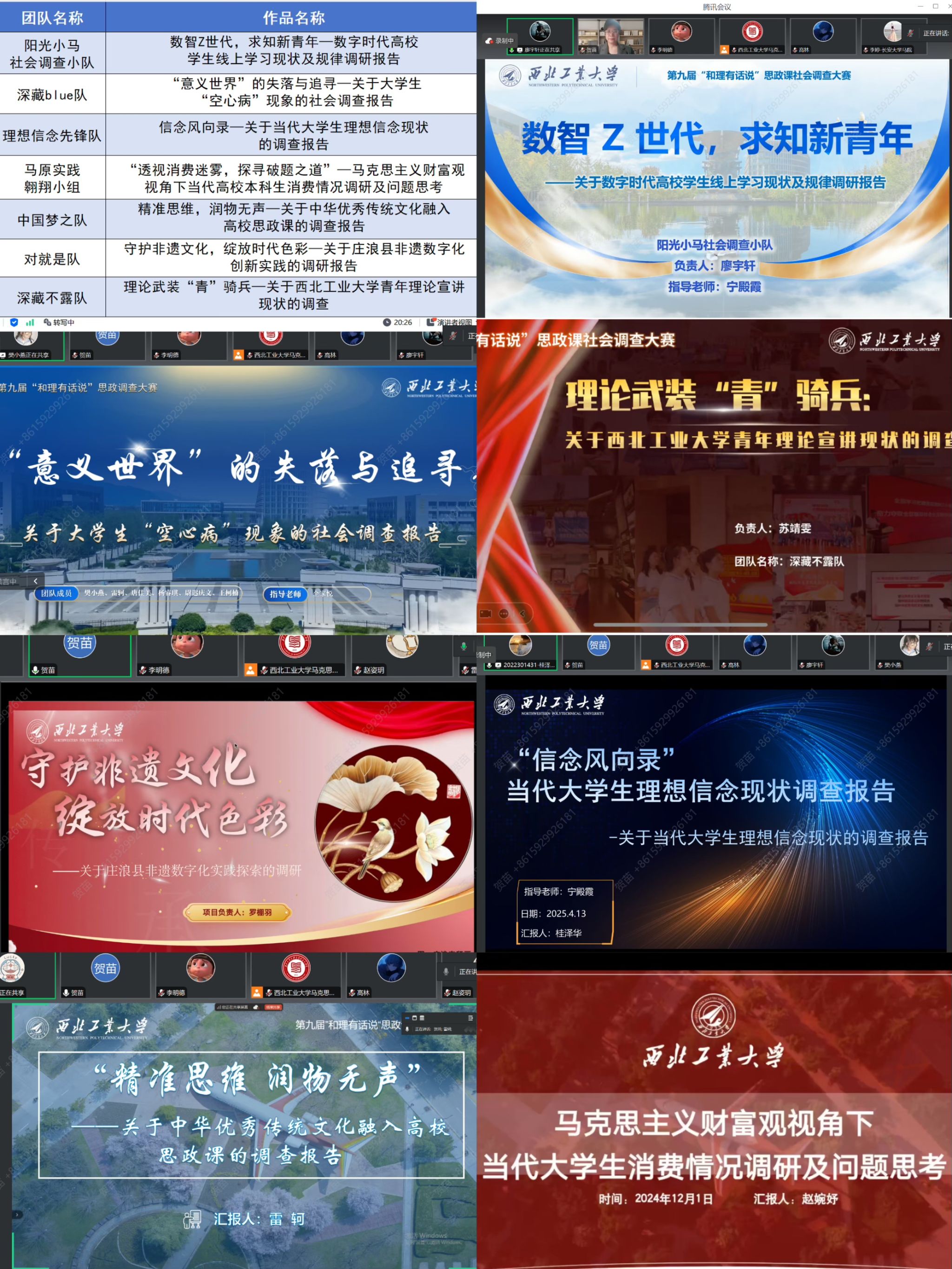 2025年4月13日晚7:00,由西北工业大学党委学生工作部、共青团西北工业大学委员会、西北工业大学教务部、西北工业大学研究生院、西北工业大学马克思主义学院、西北工业大学陕西省重点舆情信息研究中心联合举办的第九届“和理有话说”思政课社会调查大赛暨成果展示通过线上形式顺利举办。会议邀请到西安交通大学李明德教授、长安大学李婷教授、西北工业大学党委学生工作部副部长、学生处副处长管峻担任评审专家,会议由马克思主义学院副院长、舆情中心副主任贺苗主持。