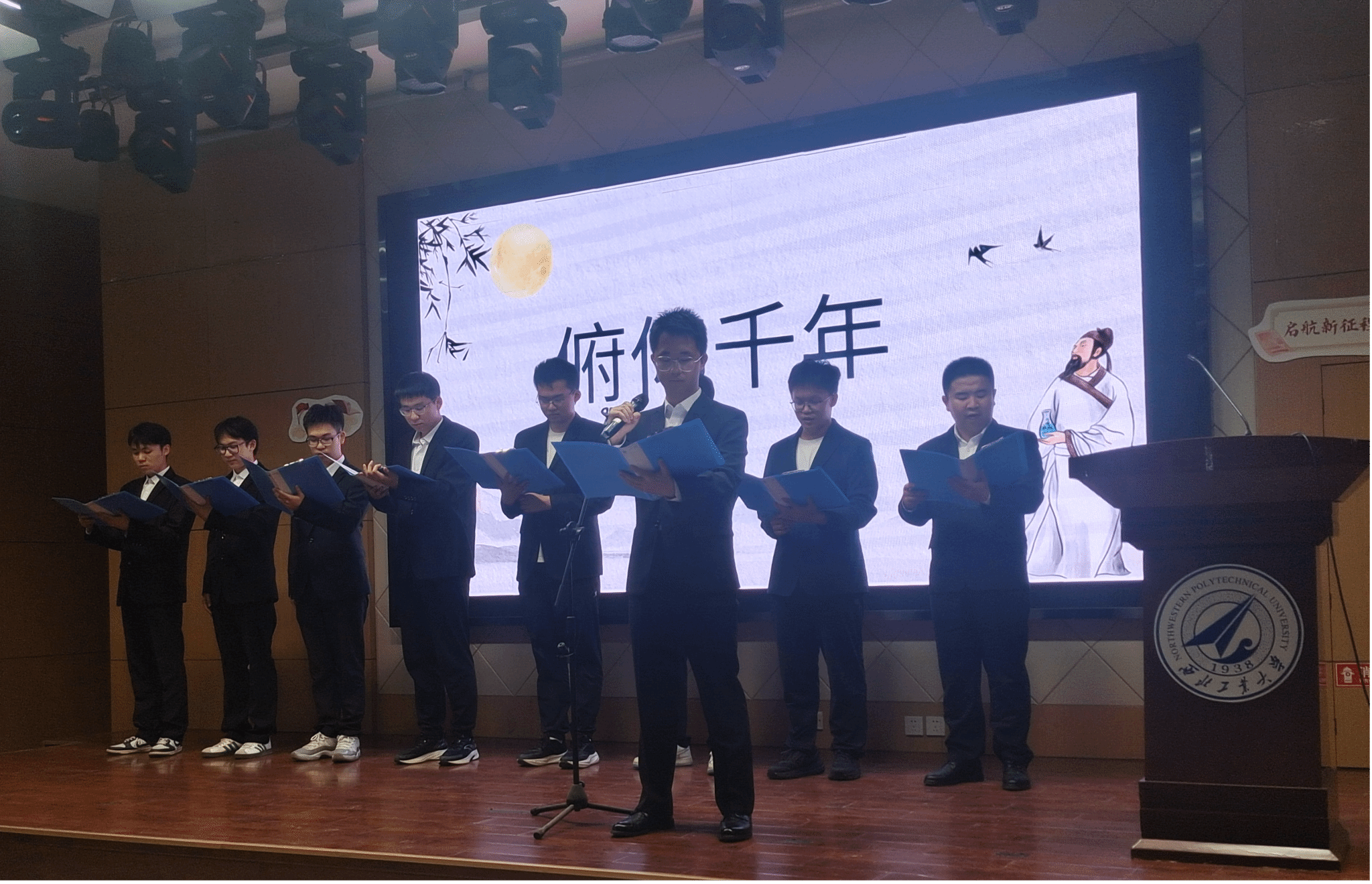 4月19日晚,在马克思主义学院207报告厅,参加诗歌朗诵会的同学经过抽签,筛选出来自全校的十个朗诵小组,现场朗诵并表演他们自创的诗歌作品,其余同学提交朗诵视频参赛。这些作品有的抒写家乡建设的成就、生态文明的奇迹,有的讴歌共和国筚路蓝缕的历程、祖国日新月异的巨变,有的表达对科技前辈的尊敬与仰望、科技喜报频传的自豪,有的遥想古路坝灯火、表达今日工大学子进取奋发的豪情,有的抒发青春理想、礼赞科技报国……现场诗声琅琅、同学们激情澎湃,展现出西工大学子奋进向上的昂扬风貌。