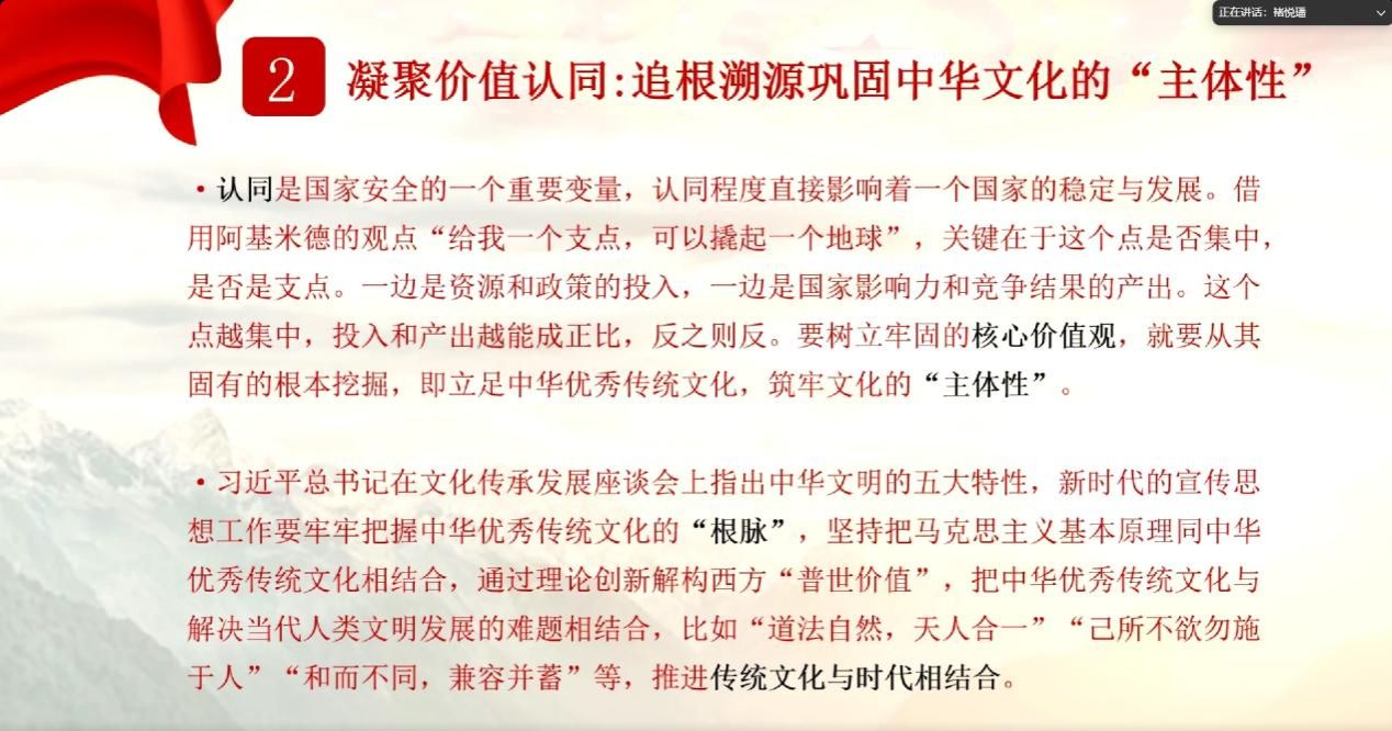 接着,西北工业大学马克思主义学院硕士生褚悦璠同学,以“两个巩固”根本任务的内在逻辑和实践要求为主题对文本内容进行了深入浅出的解读。同时,她认为宣传思想工作,从根本上就要为人民服务,反映人民呼声。同时还要用科学的先进思想和理论武装头脑,引领社会发展。