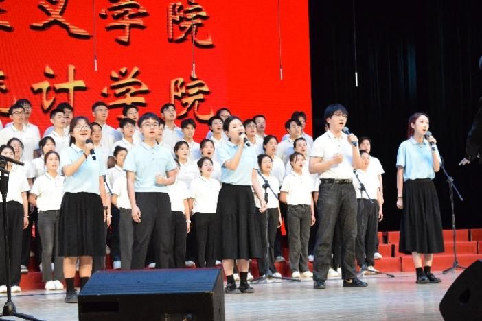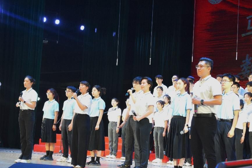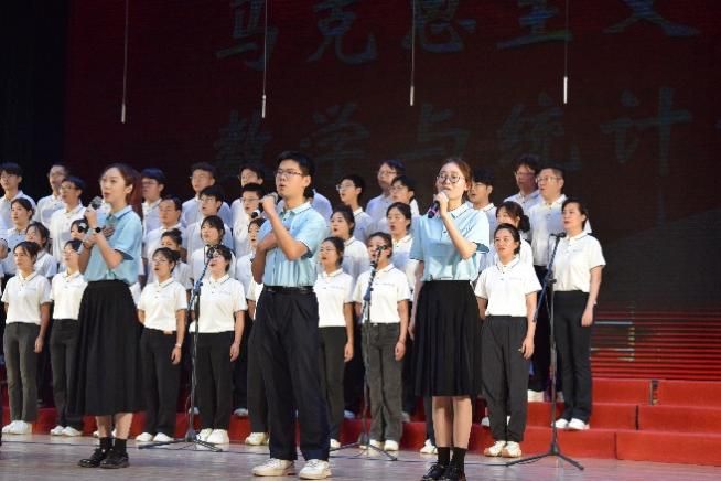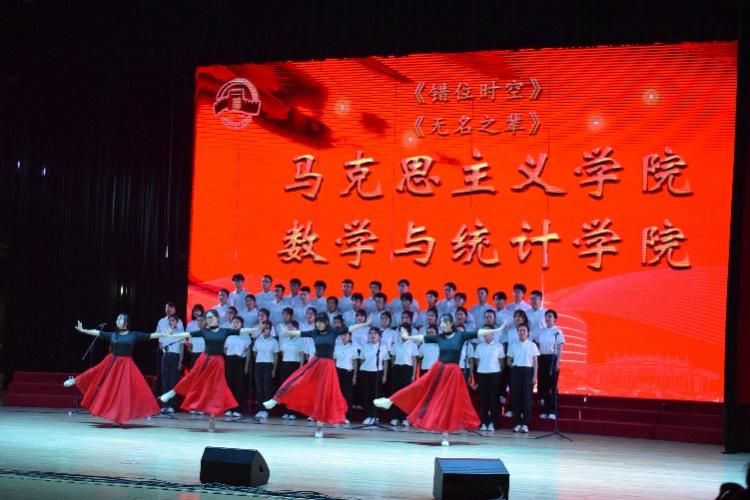 尾声副歌部分迎来情感巅峰,数学与统计学院党委书记王莉、党委副书记张莹和马克思主义学院副院长贺苗、党委副书记耿云辉共同登台,以铿锵如金石、深情似涓流的朗诵融入合唱声浪。四位老师饱含深情的朗诵,深情礼赞了平凡奋斗者汇聚的磅礴伟力,极大地鼓舞了在场师生。