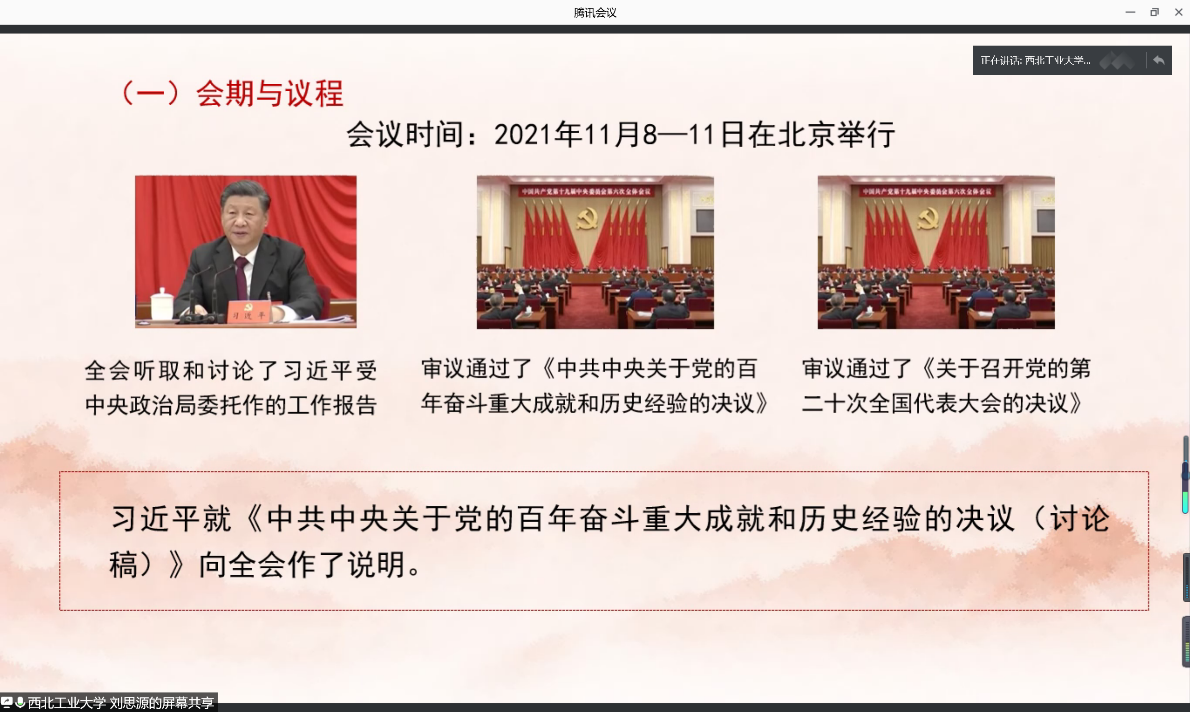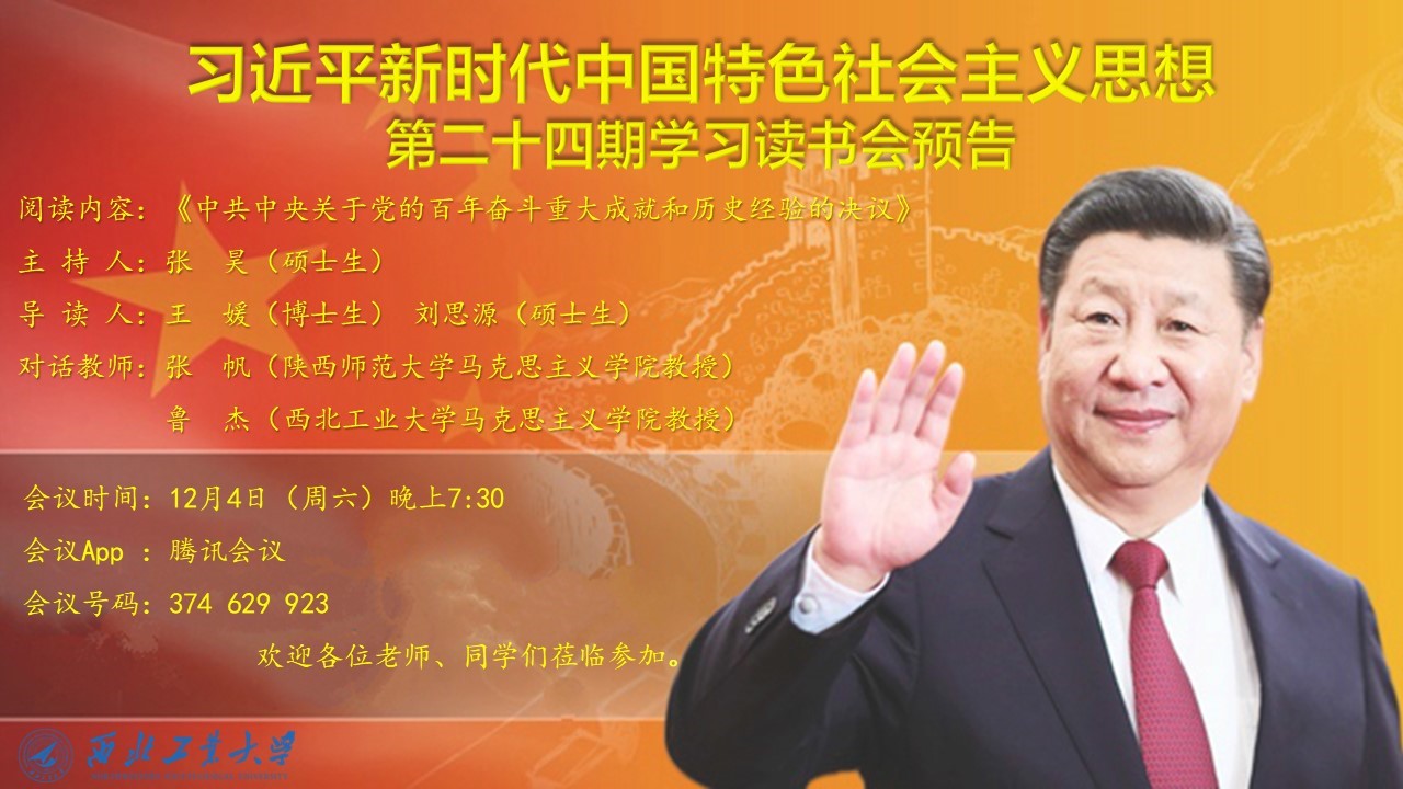 为深入学习十九届六中全会决议,推进习近平新时代中国特色社会主义思想进教材、进课堂、进头脑。2021年12月4日,西北工业大学马克思主义学院习近平新时代中国特色社会主义思想学习读书会第二十四期活动主题围绕《中共中央关于党的百年奋斗重大成就和历史经验的决议》进行学习研讨。本次读书会由我院思想政治教育系主任、博士生导师鲁杰教授发起,学院硕士生张昊主持,陕西师范大学马克思主义学院张帆教授作为对话教师应邀参加,学院党委副书记李刚老师全程参与读书会活动。