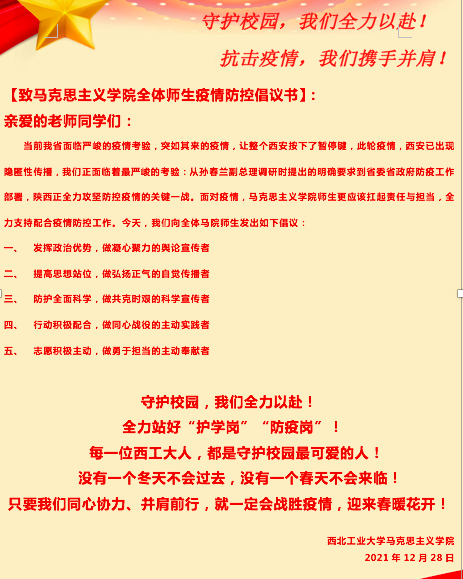 2021年即将结束,正当同学们专心准备考试、迎接新年的时候,新冠肺炎疫情突然袭击西安,扰乱正常的学习和生活节奏。在学校的高度重视和快速反应下,马克思主义学院第一时间采取多种措施保障老师和同学们的安全,学院师生积极响应学校号召,在“非必要不离校”的指示下积极投身各项工作,生动展现了当代青马人的风采。