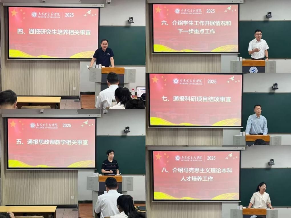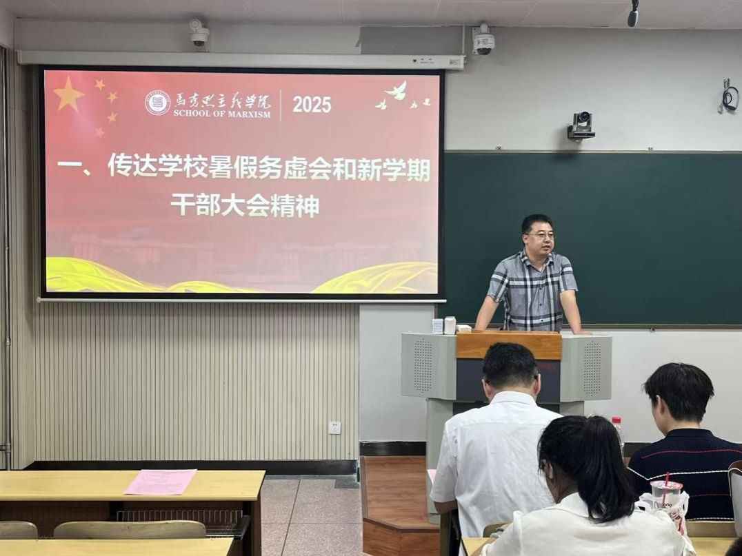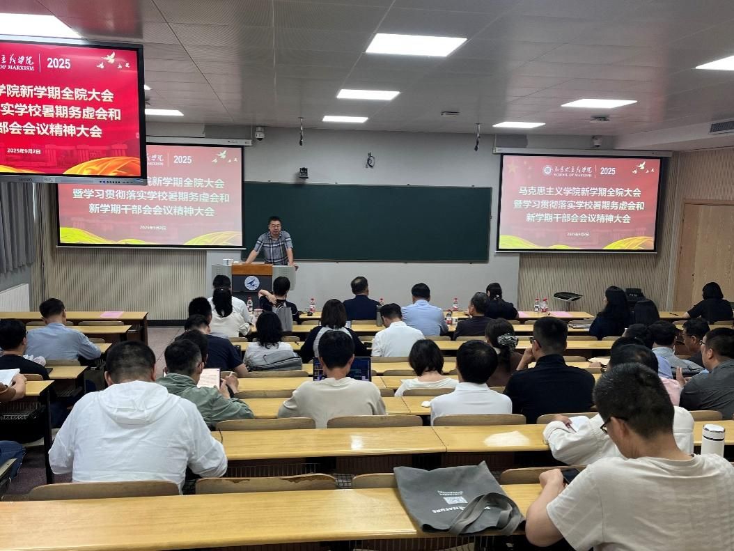 9月2日下午,马克思主义学院在友谊校区西馆XB301召开2025年全院大会,传达学习学校2025年暑期务虚会和新学期中层干部会会议精神,并对新学期重点工作进行部署,学院领导班子及全体教职工参加会议。会议由学院党委书记王彦革主持。