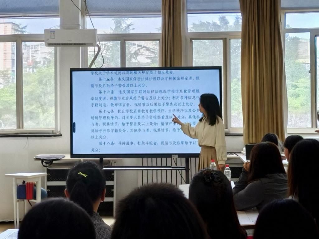 随后,杨思羽带领新生集体学习《西北工业大学研究生手册》《西北工业大学学生违纪处分管理办法》等文件,立足学校规章管理制度为新生讲解研究生日常管理规定和违纪处分实施细则。最后,25218-01班和25218-02班分班讨论了班级事务。