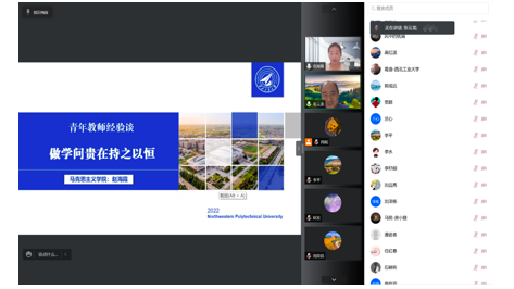 2022年1月16日19:30,由西北工业大学马克思主义学院发起主办朋辈思政课《青年教师经验谈》第2期如约而至。本期主讲人为学院青年教师赵海霞副教授,我院全体研究生和部分教师通过在线方式参加了本次讲座。研究生秘书肖妮老师主持报告会。