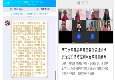 疫情突至,作为本科思政课日常教学负责人,贺苗老师在教务部门和院领导统一要求和指导下,与“毛泽东思想与中国特色社会主义理论体系概论”课程负责人高旭红、华艳君反复协调商议,课程全体老师全力以赴,更迭预案,顺利完成覆盖2200人的大规模在线考试,获得学生普遍认同。为确保在线教学质量,在各课程教学负责人和教学督导的支持下,与每个课程组分别召开集体备课,做好突发情况预案,跟进发布与疫情相关的教学素材,在教师们共同努力下,思政课有效发挥疫情防控期间学生价值引领作用。