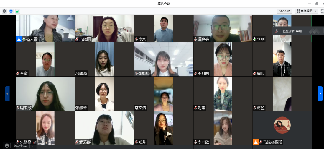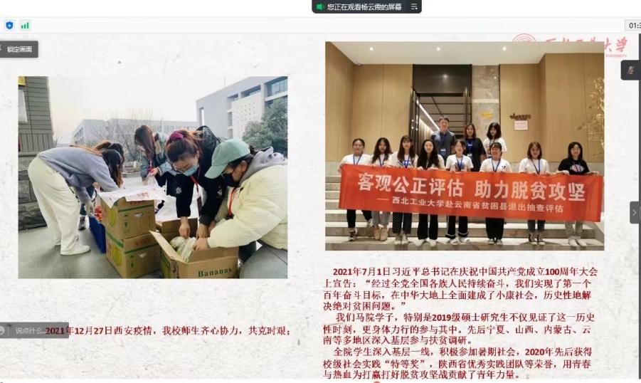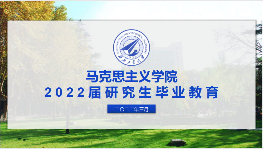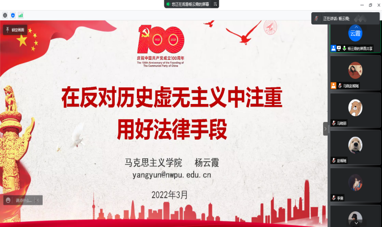 为深入贯彻党的十九届六中全会精神,以饱满的热情、昂扬的姿态,开启人生新征程,谱写人生新篇章,喜迎党的二十大胜利召开,结合学校《关于做好2022届研究生毕业教育工作的通知》,2022年3月29日19:00,西北工业大学马克思主义学院在线上开展了2022届研究生毕业教育系列活动,马克思主义学院院长杨云霞、2022届全体毕业生及部分学生党员代表参加此次活动,由学院党委副书记李刚主持。