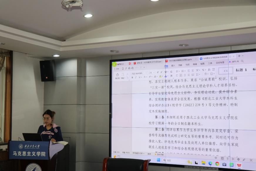 学院兼职辅导员邵明岚作为代表详细解读《马克思主义学院本科生综合测评办法(征求意见稿)》,清晰传递了综合测评核心规则,为后续广泛收集学生意见、综测办法完善优化与平稳落地筑牢基础。