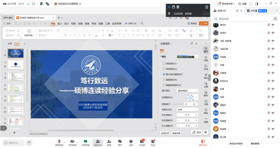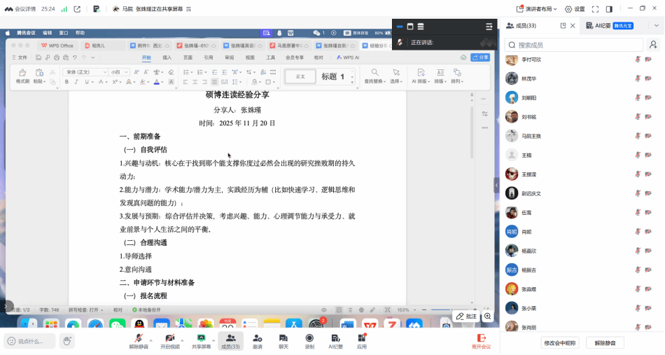 四位同学分享交流后,肖妮就硕博连读的招生政策作了系统解读。她详细介绍了政策核心要点与具体操作规范,清晰梳理申请全流程节点,明确材料准备的关键要素与注意事项,为有申请意向的同学提供实操性指导。随后,王换作总结发言,强调学术严谨与学术诚信在科研道路上的根本性意义,并鼓励同学们树立“静水流深”的发展观,以自觉、自律、自强的信念和持之以恒的平稳心态,积极投入到硕博连读的申请与学术生涯规划之中。