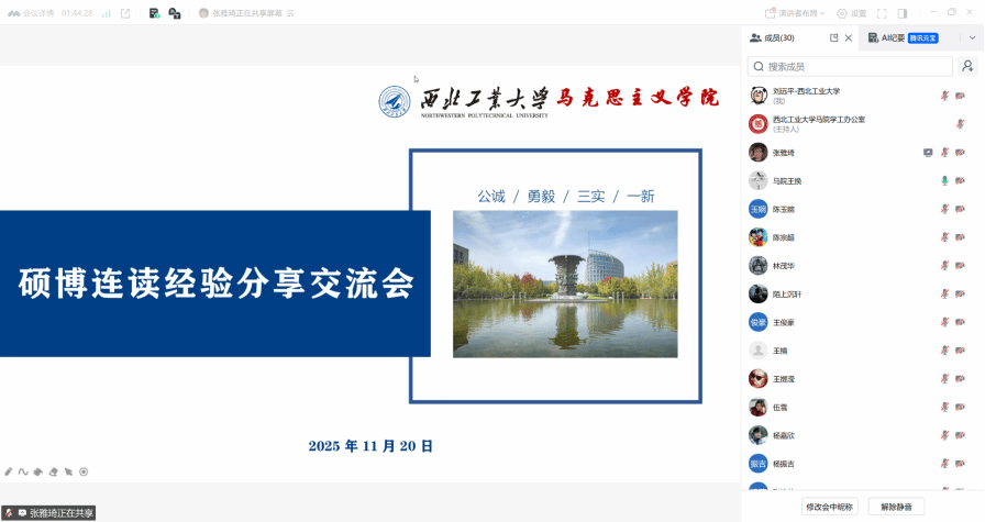 为帮助有意愿申请硕博连读的同学厘清升学路径,解答备考疑惑,缓解心理压力,马克思主义学院于11月20日举办线上硕博连读经验分享交流会。本次会议以“朋辈引领+政策解读”为主线,通过经验分享、政策剖析为学子们搭建高效互动、共同成长的交流平台,助力学生在学术深造的道路上行稳致远。硕士辅导员王换、研究生培养秘书肖妮及学院学生共同参与,会议由王换主持。