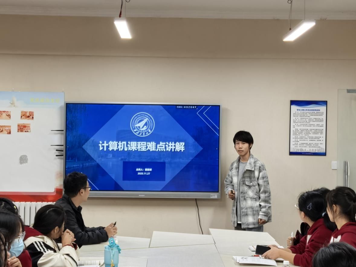 为加强学风建设,深化公共基础课程学习成效,强化学科知识融通,11月27日,马克思主义学院在“一站式”学生社区举办第二期“学业辅导站”活动。本期活动特邀网络空间安全学院优秀学生蔡思博担任主讲,围绕《大学计算机基础》核心内容,通过系统讲解与实例分析助力同学们夯实课程基础。我院2025级全体本科生参加本期“学业辅导站”,活动由辅导员董润主持。