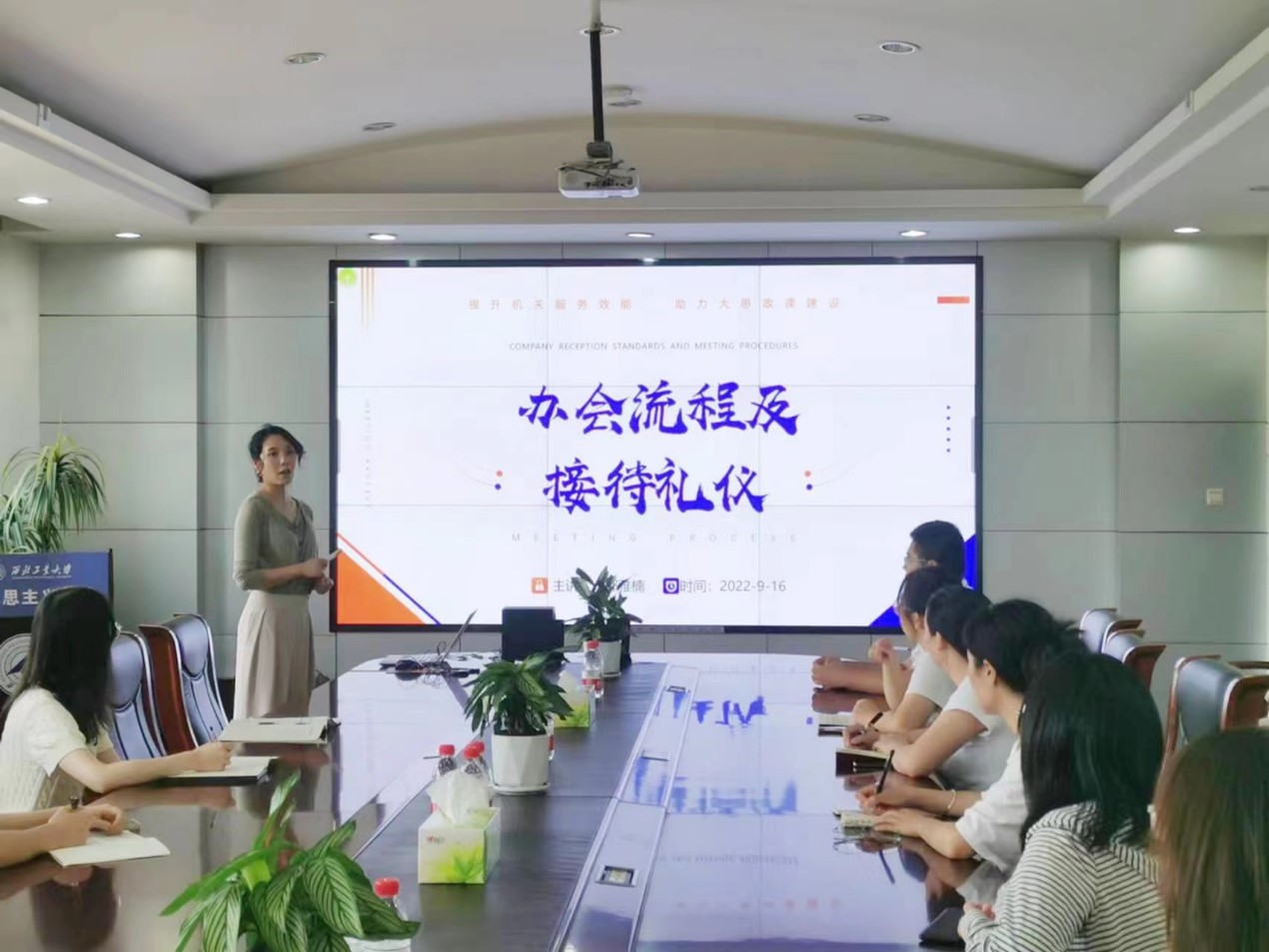 为进一步提高学院管理人员职业素养、提升院办管理服务效能,助力大思政课建设,9月16日,马克思主义学院机关在学院208会议室开展了“以提升管理服务效能为抓手,助力学院大思政课建设--办会流程与会务礼仪”专题培训,学院全体行政管理教师和学生骨干参加了会议。会议由学院办公室主任郭雅楠主持。