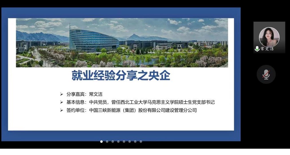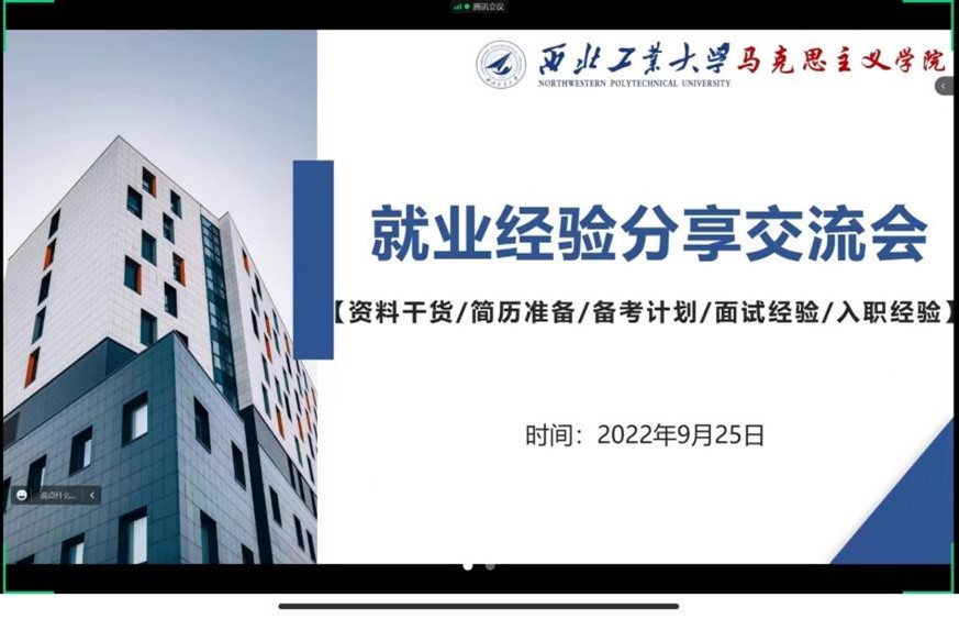 为帮助同学们了解求职的流程,增进对不同就业岗位的认识,加强朋辈之间的交流学习,西北工业大学马克思主义学院于9月25日线上开展就业经验分享交流会。活动邀请到六位已经获得心仪offer的2022届校友,他们从硕博连读、选调公务员、思政课教师、入职央企四个求职方向给同学们分享心得体会和宝贵经验。学院党委副书记李刚及硕士生共同参加,本次分享会由兼职辅导员单璐玉主持。