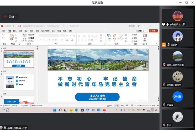 推进校园廉洁文化建设,全面增强学生党员廉洁意识,营造风清气正的校园氛围。2022年11月2日10:00,西北工业大学马克思主义学院党委副书记李刚老师采取线上线下相结合的方式,以“不忘初心、牢记使命”做新时代青年马克思主义者为主题,为学院全体学生党员讲授“廉洁诚信”教育专题党课。