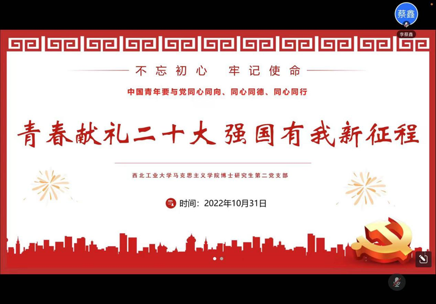百年逢盛会,青春正当时。10月31日晚上,西北工业大学马克思主义学院博士生第二党支部在线召开了“青春献礼二十大 强国有我新征程”的主题党日活动。主题党日以集体学习和集体讨论相结合的形式,组织党员学习党的二十大报告全文,接受思想滋养,凝聚青春力量。博士生第二党支部全体成员参加了会议。会议由支部书记李水主持,各位党员首先就党的二十大报告开展了集体学习,随后分别讨论了各自的学习体会。