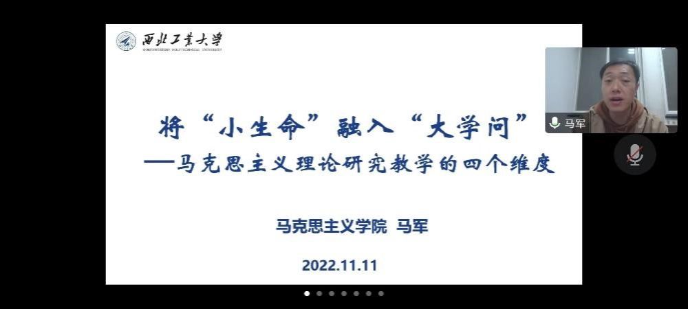 2022年11月11日19:00,西北工业大学马克思主义学院朋辈思政课《青年教师经验谈》系列讲座第五期如约而至。讲座通过腾讯会议的形式,广大师生相约云端,共研学术课题,感念师生情谊。本期主讲人为学院助理教授马军,学院全体学生和部分教师参加了本次讲座。会议由学院党委副书记李刚主持。