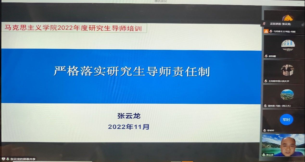 11月20日晚,马克思主义学院在线召开2022年度研究生导师培训会,学院领导、研究生导师及青年教师代表等参加了培训会。培训会由副院长张云龙教授、党委副书记李刚副教授、院长杨云霞教授主讲。学院党委副书记(主持工作)蒲传新主持了培训会。