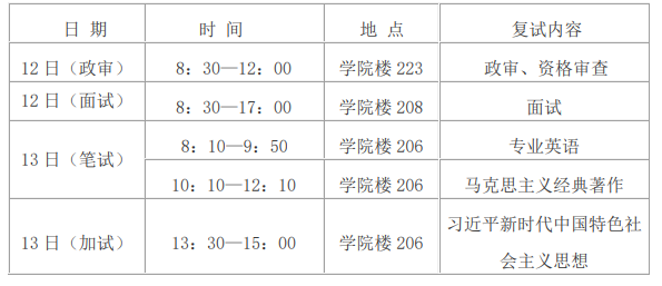 复试由面试和笔试两部分构成。面试包括思想政治与专业综合能力考核;笔试含专业外语和马克思主义经典著作考核。每项考核满分均为100分。复试内容及要求如下: