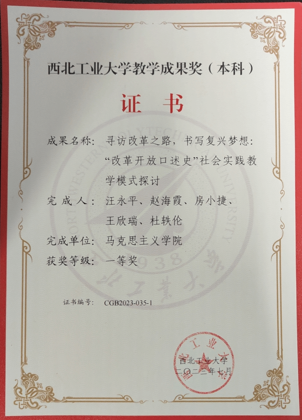 从2018年起,汪永平老师主持了《中国近现代史纲要》课程中开展的“改革开放口述史”社会实践。作为负责人,汪永平老师带领课程团队,对学生进行指导。她亲自拟定教学大纲,制定操作规范,聘请专家对师生进行培训,指导学生撰写报告,主持优秀口述史的颁奖,并带领学生进行暑期社会实践,参加“口述史国际周”学术活动等,形成完整的教学科研闭环。在教学理念、教学方法、教学模式、教育路径方面进行系统改革,在课程实践性、研究性、思想性及整体性等方面都取得明显成效。六年来,使众多授课学生增强了制度自信、道路自信与文化自信,增强了国家认同感与政党认同感。该项目获得2023年西北工业大学“优秀教学成果奖”一等奖。