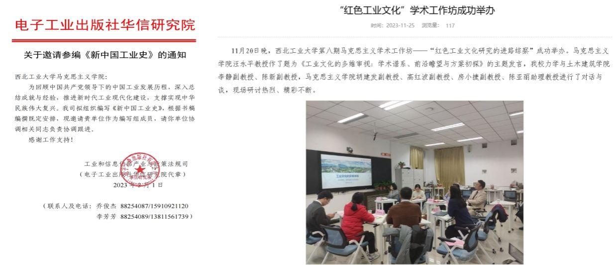 3.积极深化“红色工业文化”研究。2023年初,汪永平成立“红色工业文化研究”团队,团队成员来自西北工业大学马克思主义学院、机电学院和力学与土木学院。团队成立后,受邀参与完成了工业和信息化部政策和法规司委托项目《新中国工业史》的编撰;获批了西北工业大学“双一流学科建设”项目“研究生高水平教材”系列之“中国工业精神谱系”课题;开展工业文化研究工作坊;指导研究生撰写毕业论文“中国式现代化视野里中国工匠精神的演进历程:以劳动模范为切入点”和“十七年工业歌谣的文化精神建构研究”。