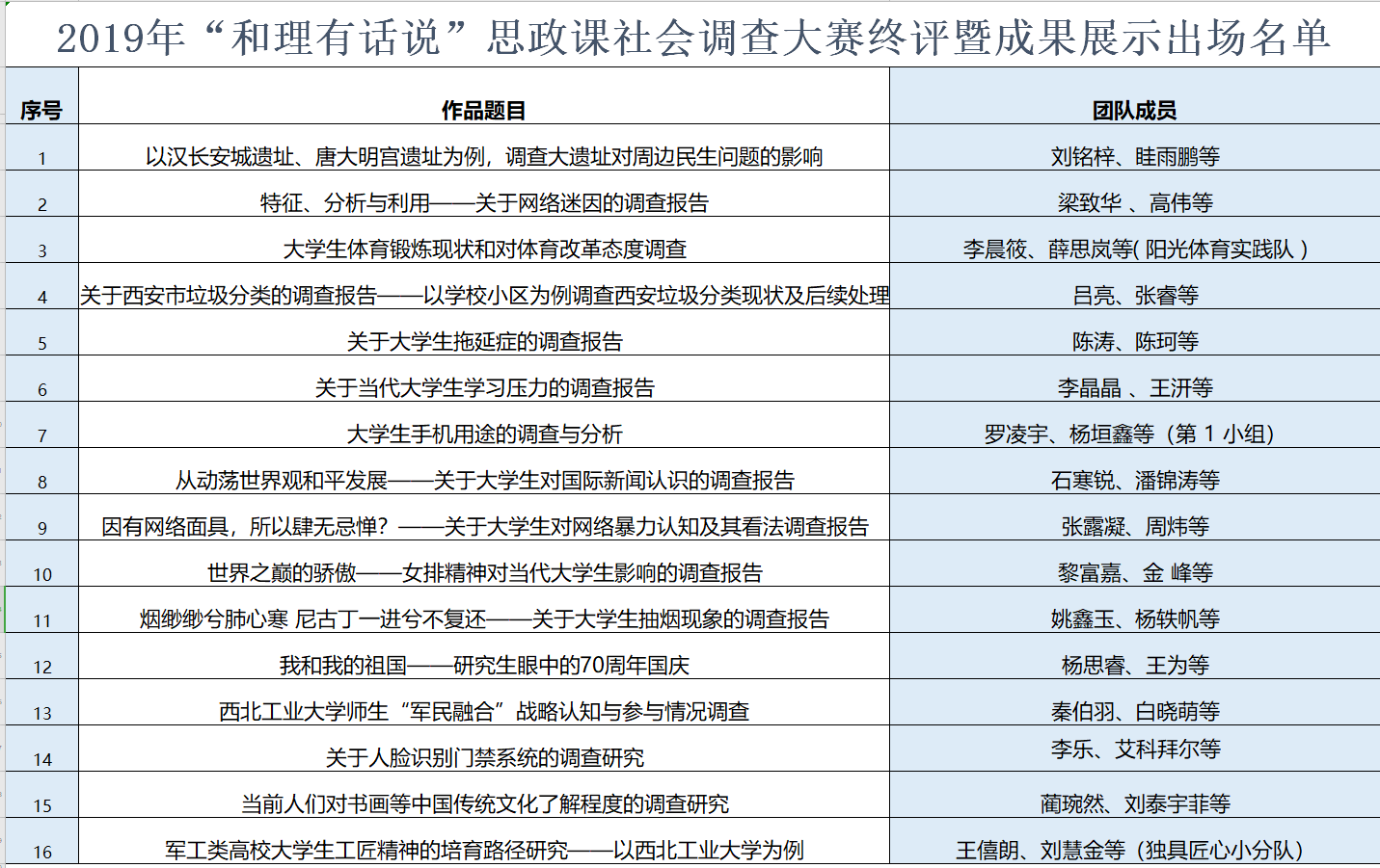 2020年4月10日19:00,由西北工业大学马克思主义学院、校党委学生工作部、西北工业大学陕西省重点舆情信息研究中心联合举办的2019年“和理有话说”思政课社会调查大赛终评暨成果展示通过在线视频的形式如期举行。此次大赛邀请到陕西日报理论评论部主任魏焱、党委学生工作处副处长马俊、马克思主义学院鲁杰教授作为评审专家,党委学生工作部部长、学生处处长代富平、马克思主义学院党委副书记吴闻川(主持工作)参加了大赛。大赛由校马克思主义学院院长助理、舆情中心副主任贺苗主持。